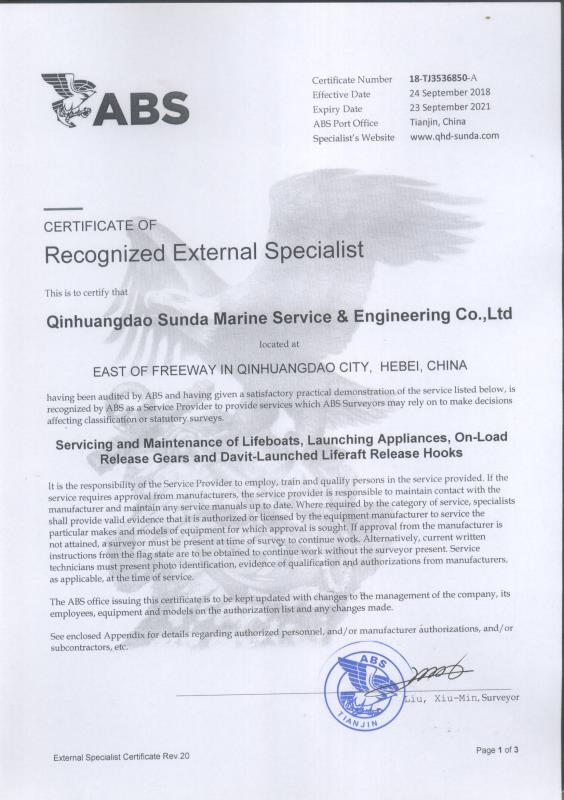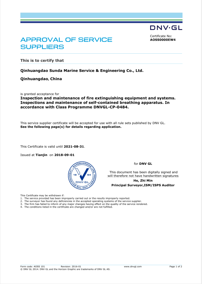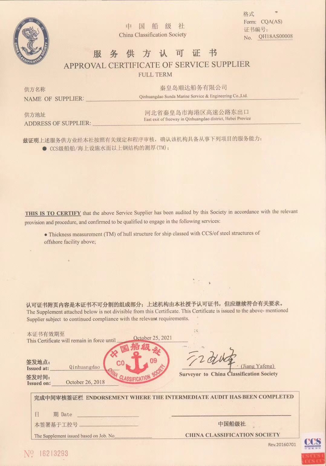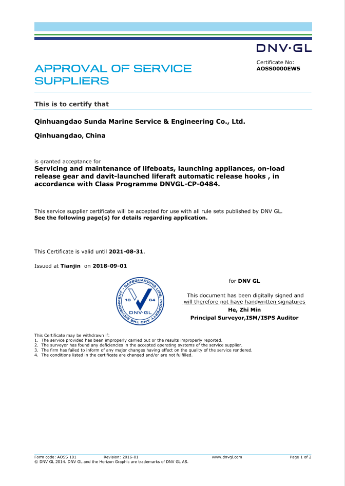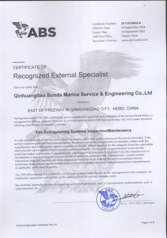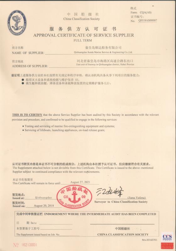 秦皇島順達(dá)船務(wù)有限公司位于美麗的海濱城市、中國(guó)北方著名的能源輸出大港--秦皇島。公司從事于船舶修理、物料供應(yīng)、水下檢測(cè)、船體測(cè)厚、消防救生設(shè)備及救生艇檢驗(yàn)、電氣自動(dòng)化修理等服務(wù)。 公司自1997年成立至今,先后為國(guó)內(nèi)外船東修理、檢驗(yàn)各類(lèi)船舶萬(wàn)余艘,積累了豐富的施工經(jīng)驗(yàn)。公司現(xiàn)有場(chǎng)地100余畝,員工30余人,以及工程用車(chē)若干臺(tái)。我們公司一直本著嚴(yán)以律己、真誠(chéng)待人、精益求精、信譽(yù)至上的經(jīng)營(yíng)理念,以優(yōu)質(zhì)的服務(wù)、專(zhuān)業(yè)的施工、合理的收費(fèi),得到了國(guó)內(nèi)外船東的廣泛認(rèn)可,贏得了良好的口碑和信譽(yù)。 公司已取得了中國(guó)船級(jí)社(CCS)、美國(guó)船級(jí)社(ABS)、日本船級(jí)社(NK)、德國(guó)船級(jí)社(DNV GL)等各個(gè)船級(jí)社的消防救生和救生艇檢驗(yàn)資質(zhì), ...
